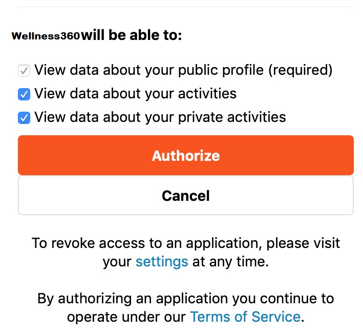 5. Tap ‘Authorize’ to confirm the connection and access to Wellness360 through Strava.