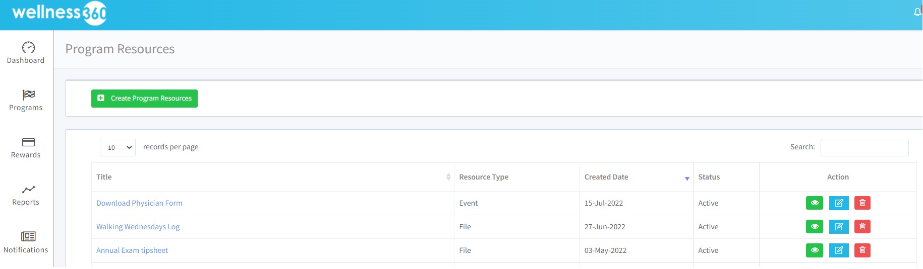 The resources can be pdf files, word documents, or even links to insurance carrier websites or other third-party websites or files. The wellness program administrator can add the needed program resources from the admin portal.