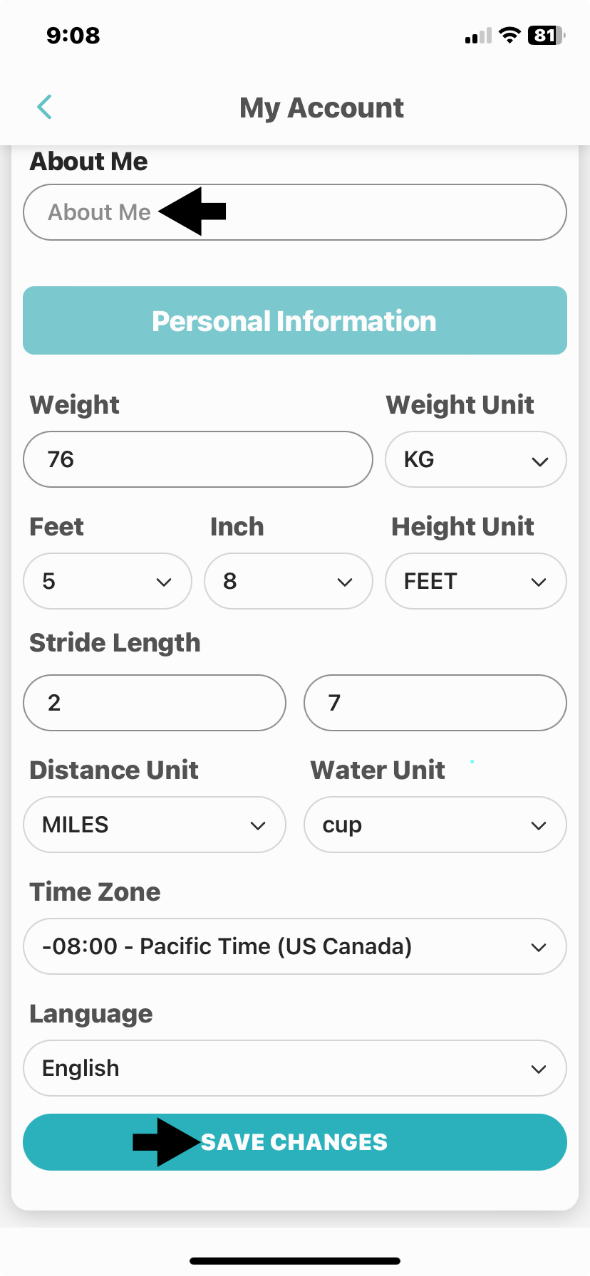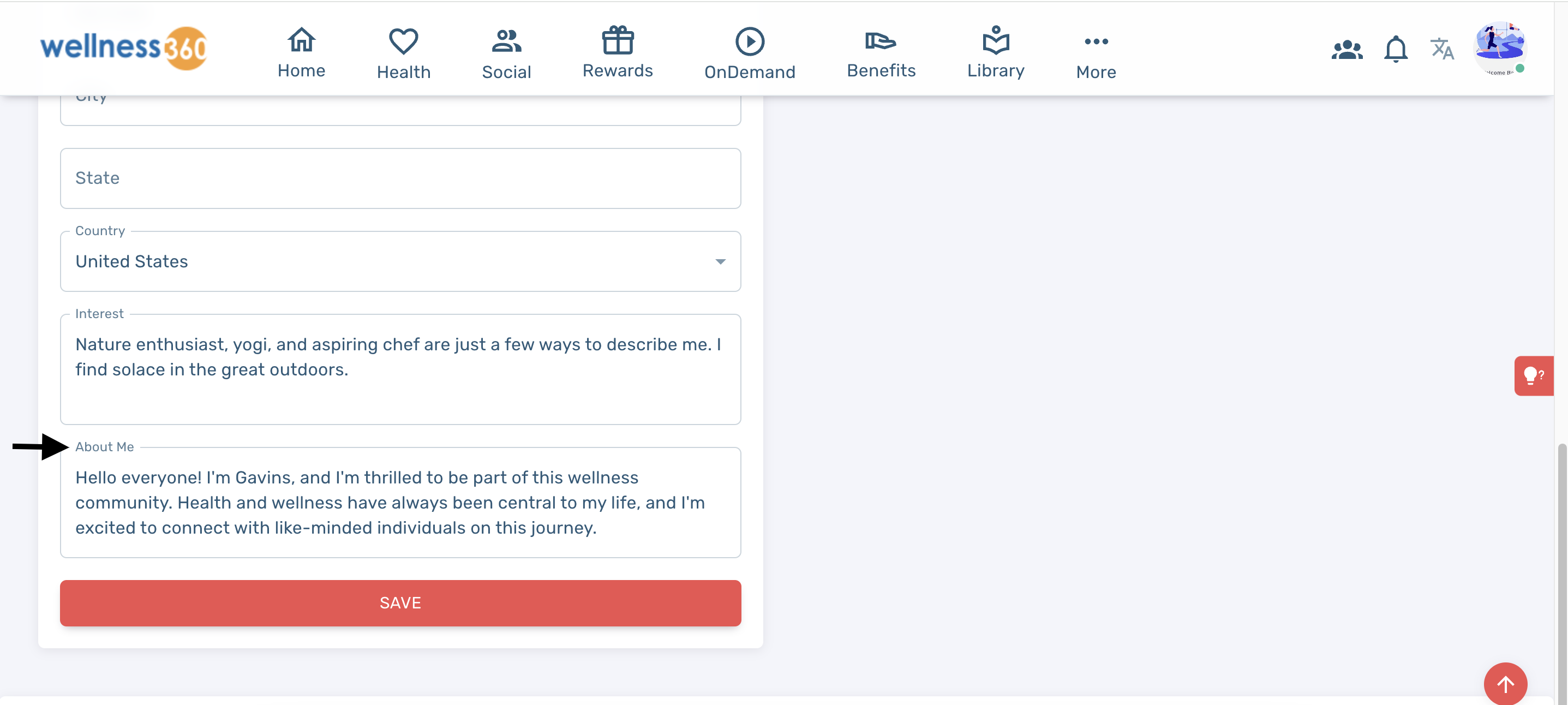 The 'About Me' section can be filled in from the user portal or the Wellness360 mobile app.