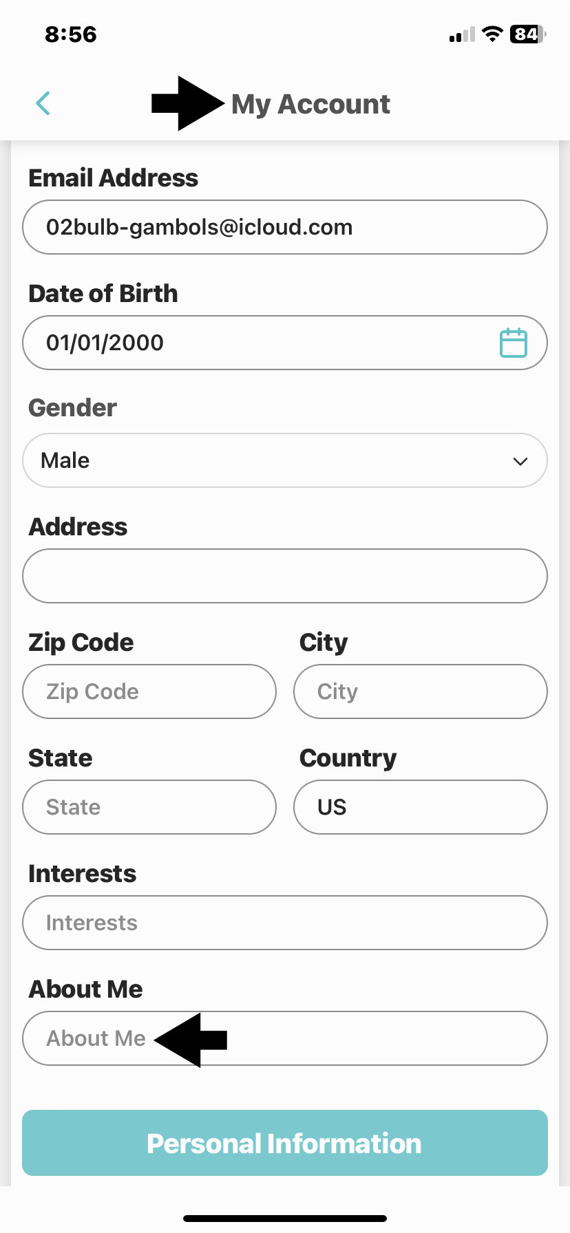 3. Find the 'About Me' section at the bottom of the 'Personal Details' section on the Settings page.