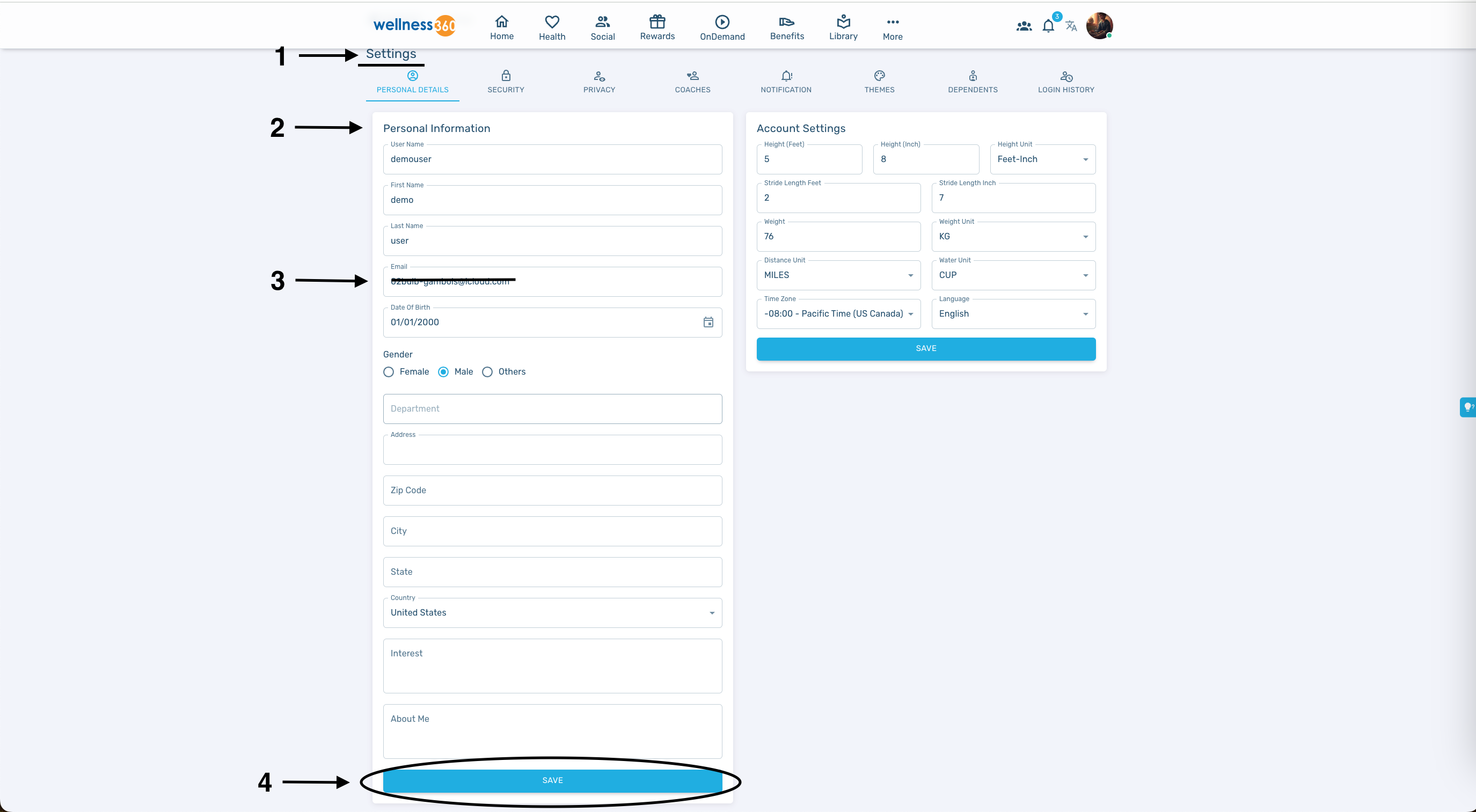 Users can change their email address by going to the user portal or the Wellness360 mobile app.